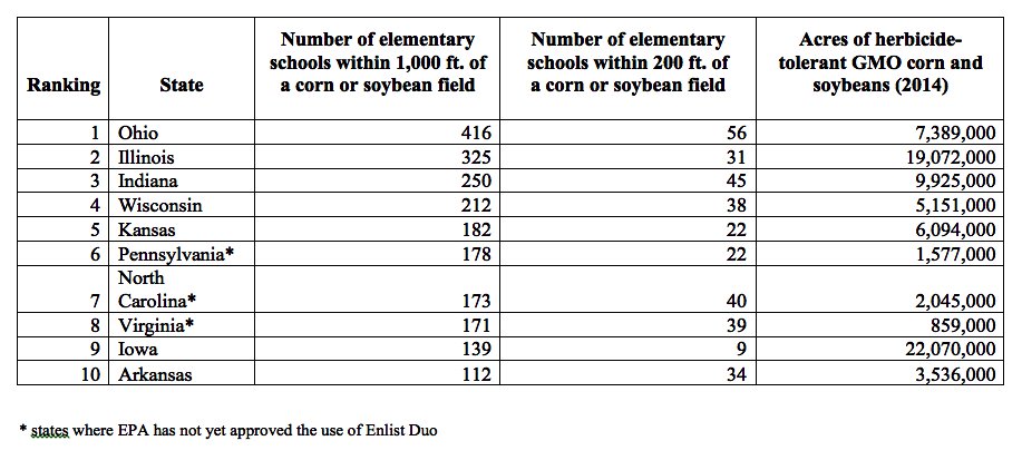The chart shows the 10 states with the most elementary schools within 1,000 feet of a corn or soybean field. These states account for 53 percent of the total acreage planted with genetically engineered GMO corn and soy. EPA has approved the use of Enlist Duo in seven of them.