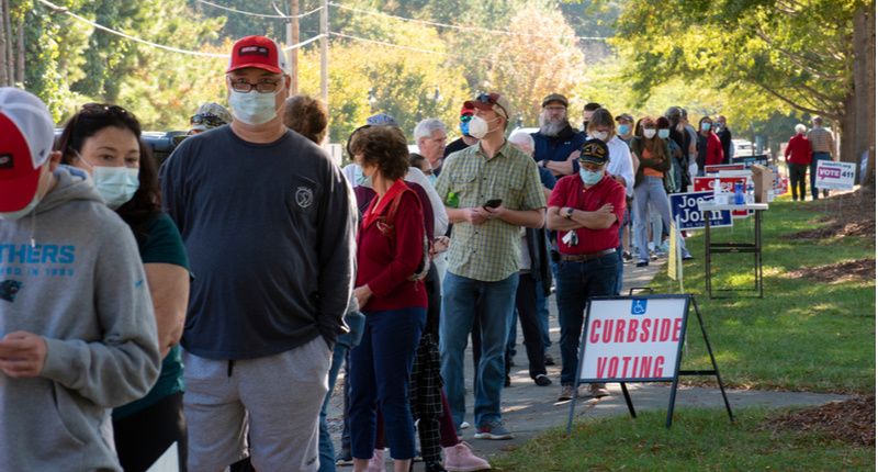 Wake Forest, NC, October 15, 2020: North Carolina voters stand in long lines to cast their ballots on the first day of early voting.