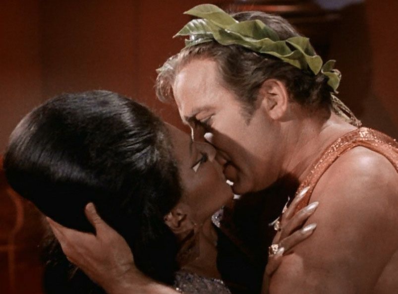 The episode’s plot is bizarre: Aliens who worship the Greek philosopher Plato use telekinetic powers to force the Enterprise crew to sing, dance and kiss. At one point, the aliens compel Lieutenant Uhura (Nichelle Nichols) and Captain Kirk (William Shatner) to embrace. Each character tries to resist, but eventually Kirk tilts Uhura back and the two kiss as the aliens lasciviously look on.