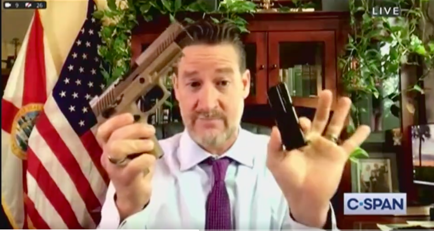 "Here's a gun I carry every single day to protect myself, my family, my wife, my home," Steube continued. "This is a XL Sig Sauer P365, comes with a 15-round magazine. Here's a seven-round magazine which would be less than what would be lawful under this bill if this bill were to become law. It doesn't fit, so this gun would be banned."