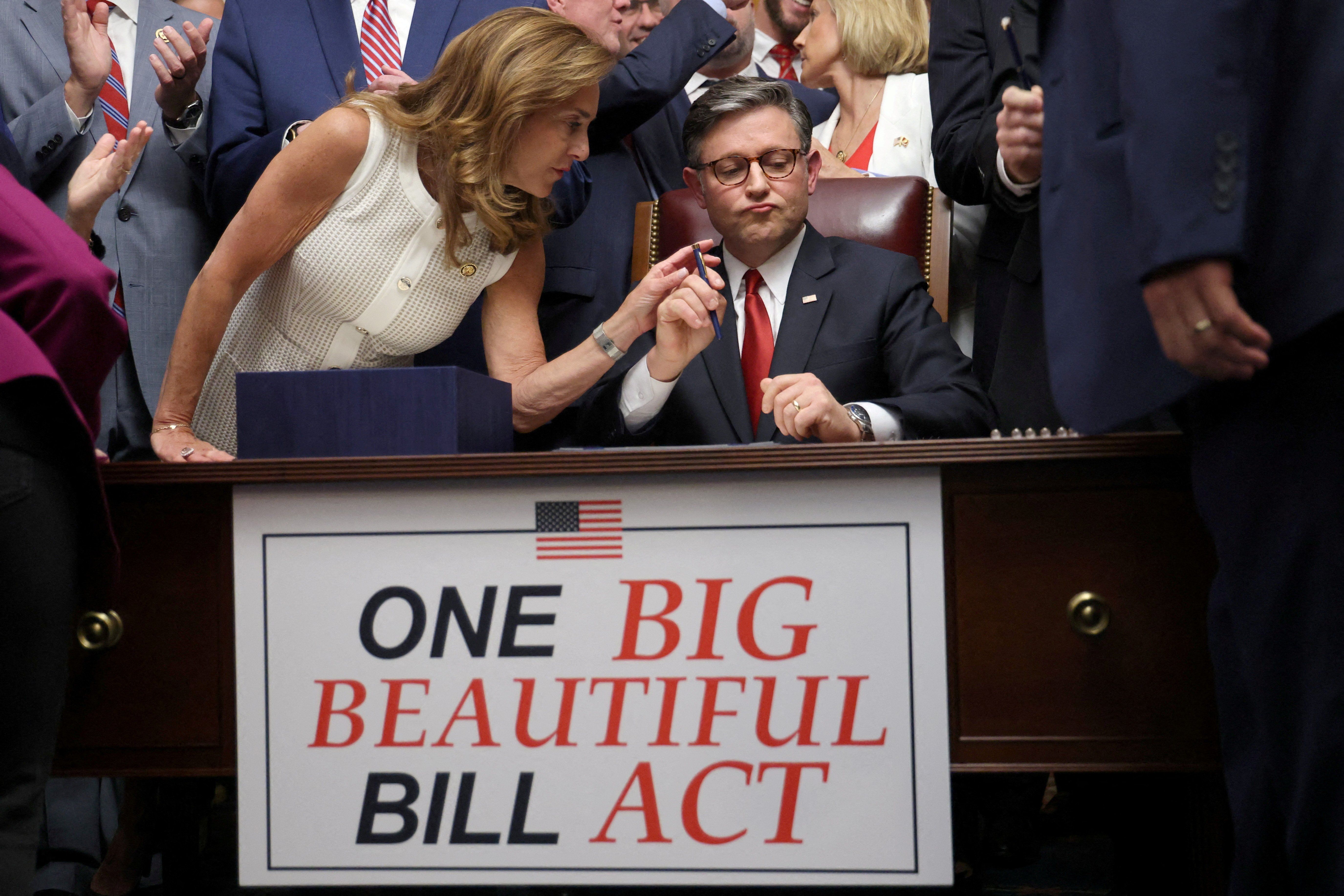 U.S. House Republican Conference Chair Lisa McClain (R-MI) grabs a pen used by U.S. House of Representatives Speaker Mike Johnson on Capitol Hill in Washington, D.C., U.S., July 3, 2025. REUTERS/Jonathan Ernst TPX IMAGES OF THE DAY