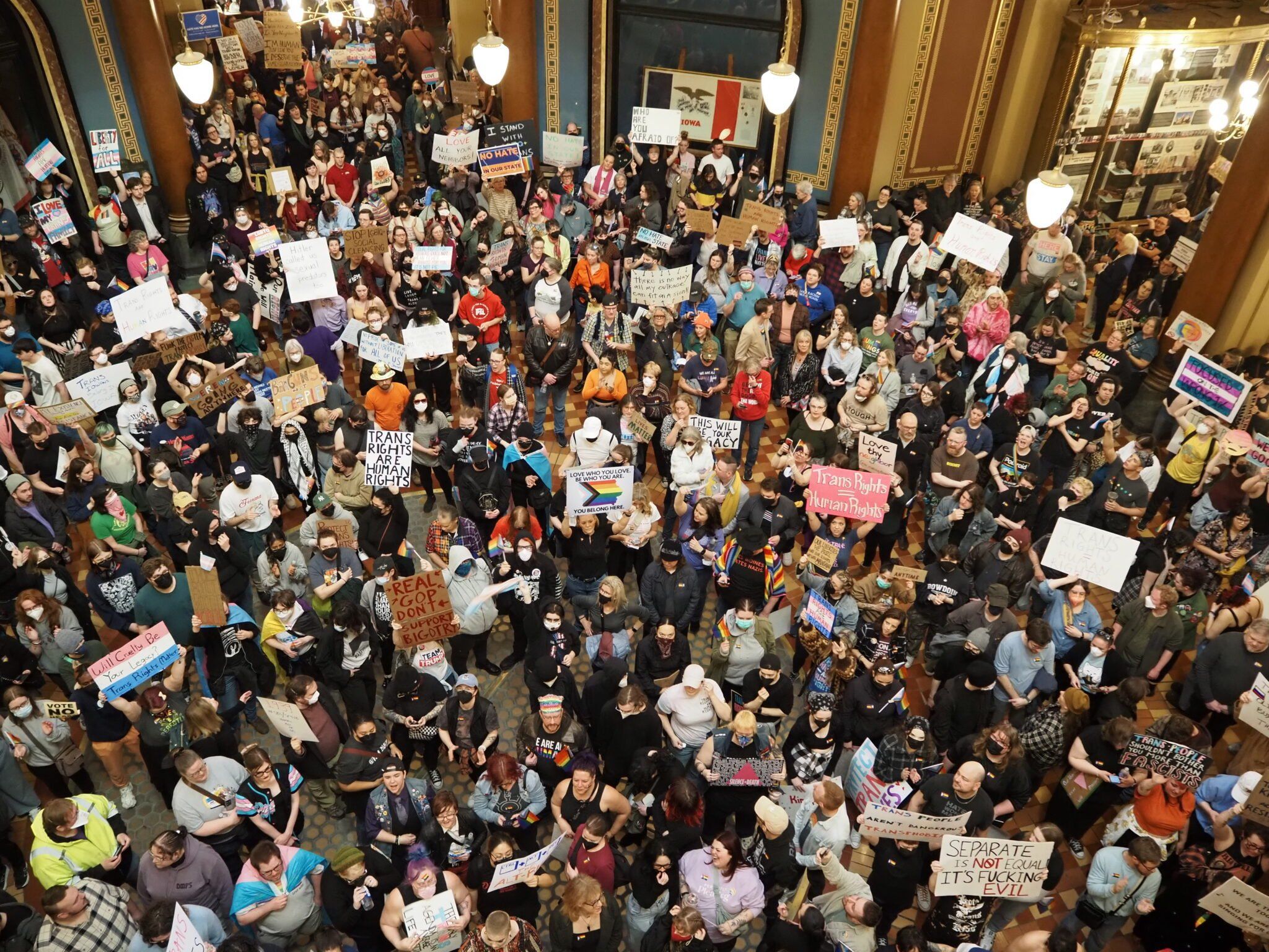 Hundreds of Iowans filled the rotunda of the Iowa State Capitol, chanting and holding signs that called for lawmakers to reject the measure. Some opponents to the legislation were removed from chamber galleries for disruptive actions.