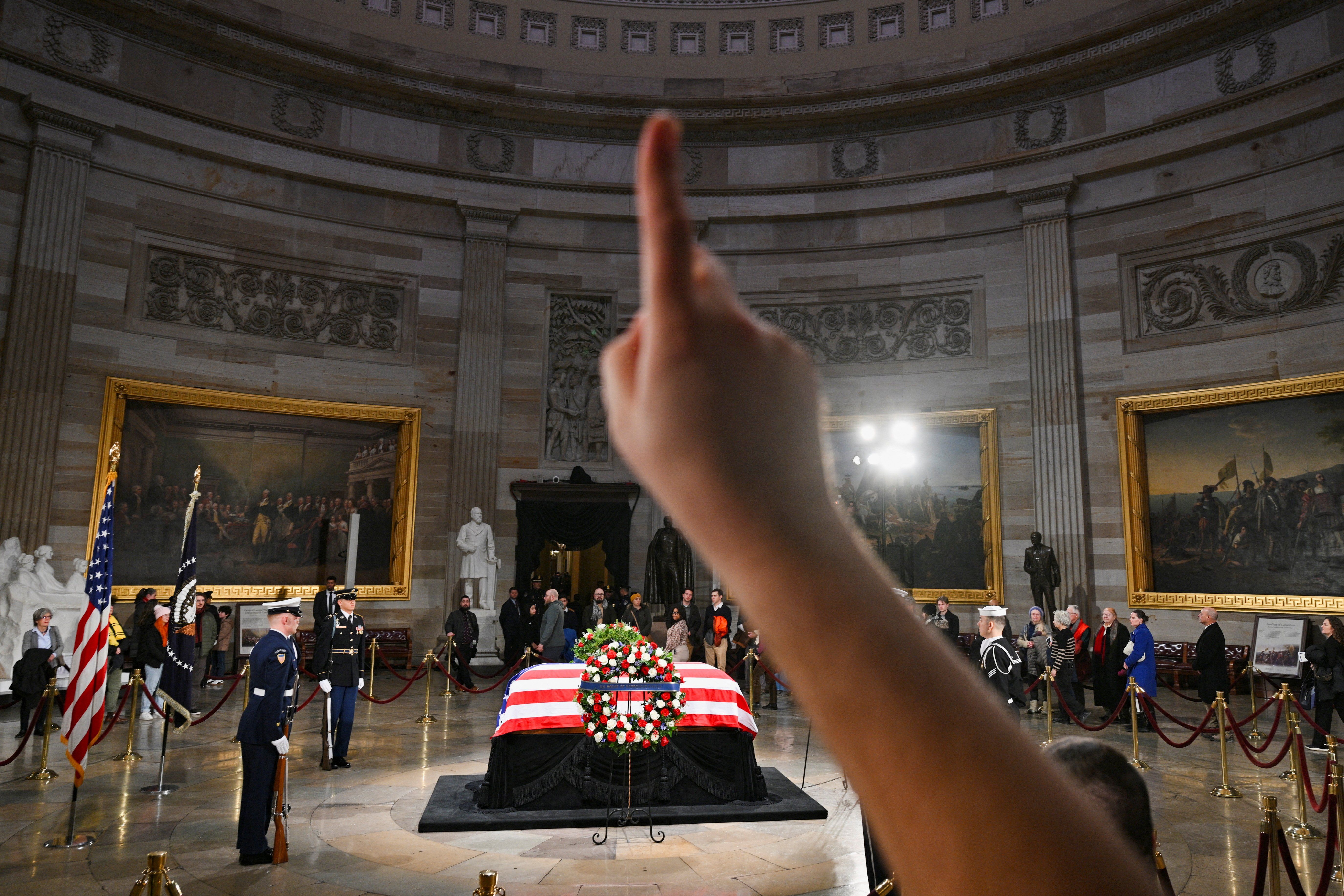 A person points upward while members of the public view the flag-draped casket of former U.S. President Jimmy Carter, as he lies in state in the U.S. Capitol Rotunda in Washington, DC, U.S., January 8, 2025. REUTERS/Jon Cherry