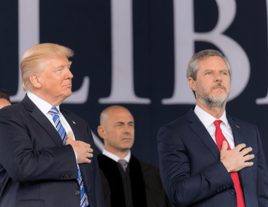 Then-President Donald Trump attends the Liberty University commencement ceremony, with Jerry Falwell Jr., May 13, 2017, in Lynchburg, Virginia. Trump gave a commencement speech to the graduating class. (Wikimedia Commons/White House photo/Shealah Craighead)