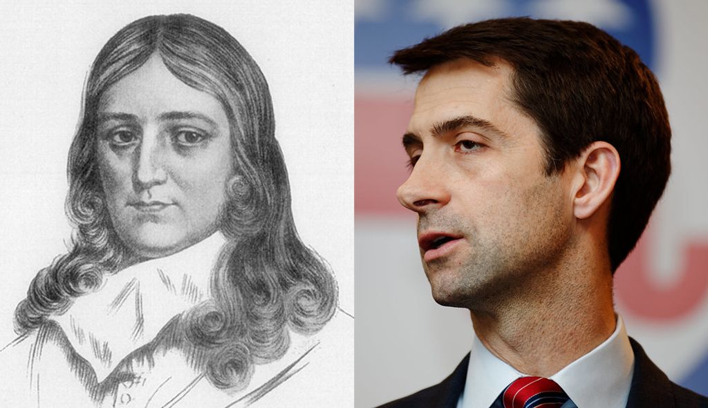 On the one hand, Milton fills "Areopagitica" with stirring exhortations about the necessity of free thought and speech. "Give me the liberty to know, to utter, and to argue freely according to conscience." Truth "has more shapes than one," and anyway, who wants everyone "to be of one mind"? Censorship is a "manifest hurt" that is an "affront" to learning. Milton's larger point is that repressing views you don't like takes away choice, and the only way to know good is by evil. Milton, it seems, would fully support the publication of Cotton's op-ed, not because he might agree with Cotton's views, but because readers are adults, and should be trusted to make up their own minds.