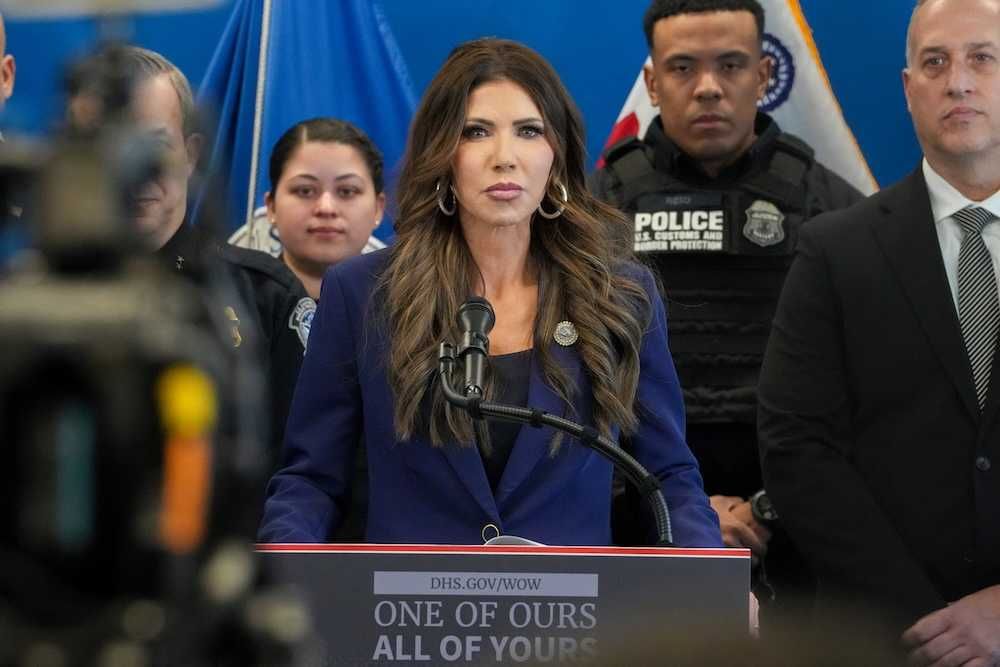 U.S. Homeland Security Secretary Kristi Noem speaks at press conference to discuss ongoing U.S. Immigration and Customs Enforcement (ICE) operations in New York City, U.S., January 8, 2026. REUTERS/David 'Dee' Delgado