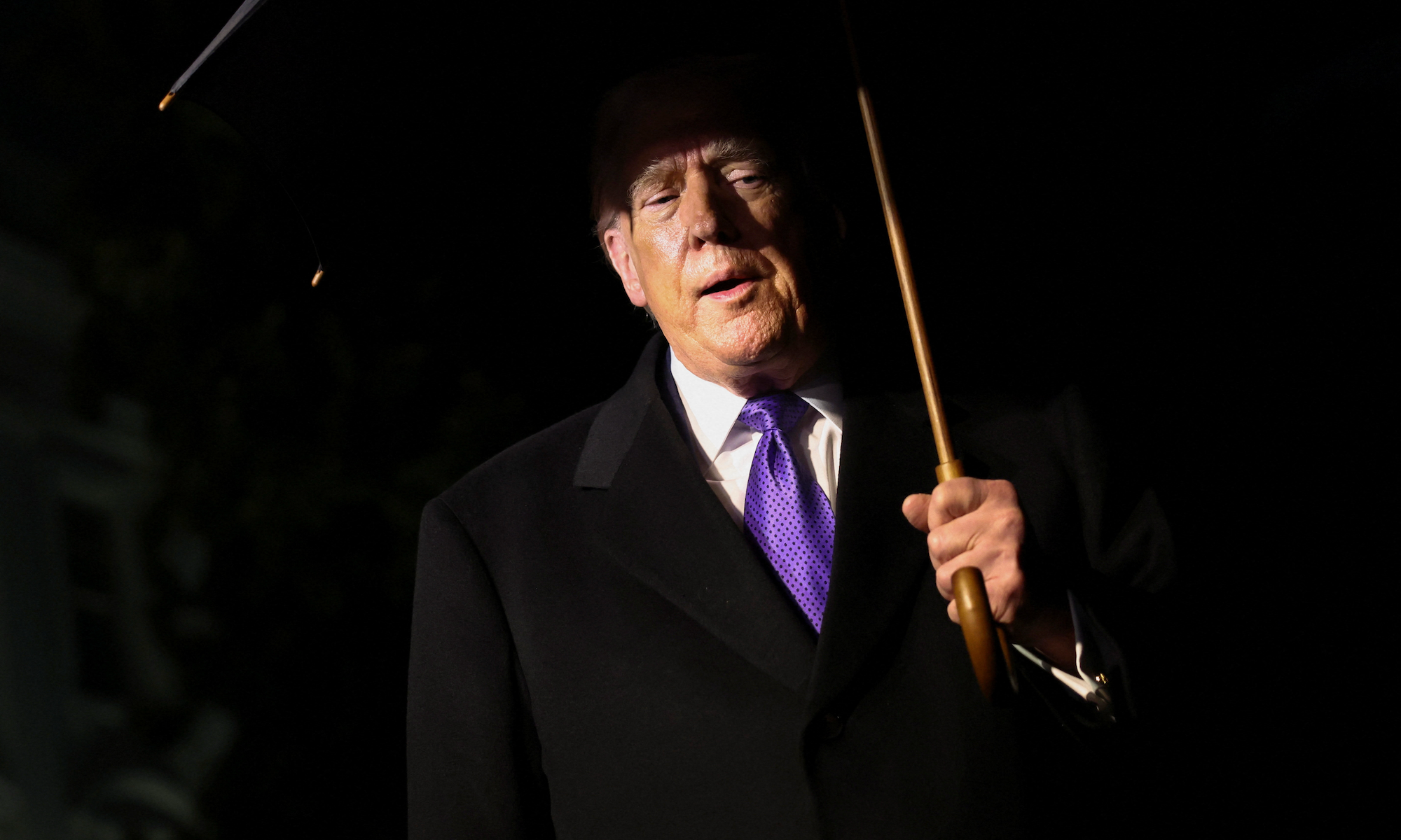 U.S. President Donald Trump holds an umbrella as he speaks to members of the media while departing the White House en route to Florida in Washington, D.C., U.S., January 9, 2026. REUTERS/Kevin Lamarque