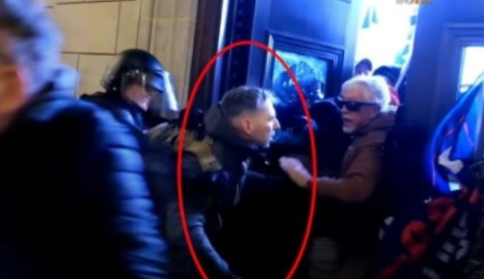 Citing court documents and security camera footage, DOJ in a statement says Major Christopher Warnagiris "violently entered the Capitol on Jan. 6, after pushing through a line of police officers guarding the East Rotunda doors. Once inside, Warnagiris positioned himself in the corner of the doorway, using his body to keep the door open and pull others inside. When a U.S. Capitol Police (USCP) officer tried to pull the doors shut, Warnagiris refused and continued pushing it open. Warnagiris can be seen pushing the officer in an effort to maintain his position in the open door in security camera footage and publicly available video footage captured shortly after 2:25 p.m."
