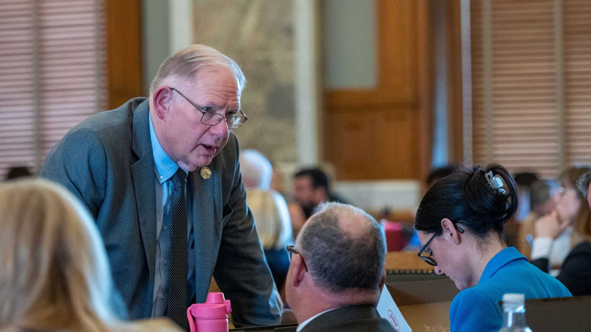 House Speaker Dan Hawkins, R-Wichita, talks with colleagues during the Jan. 28, 2026, debate on anti-trans legislation in the House. (Photo by Sherman Smith/Kansas Reflector)