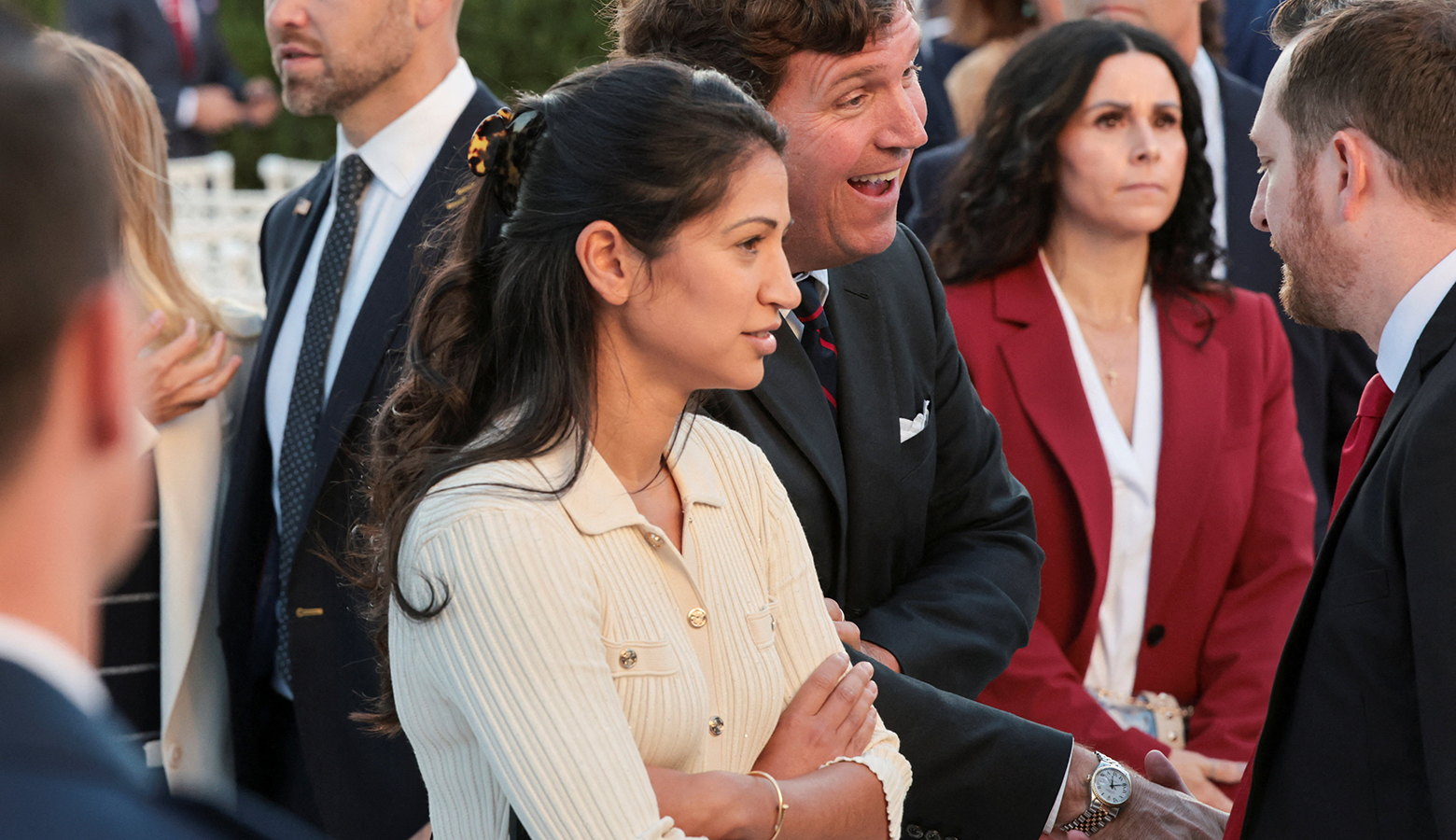 Political commentator Tucker Carlson and political advisor Katie Miller attend a ceremony held by U.S. President Donald Trump to posthumously award the Medal of Freedom to Charlie Kirk in the Rose Garden at the White House in Washington, D.C., U.S., October 14, 2025. REUTERS/Jonathan Ernst