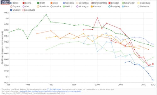 Latin America offers some useful lessons. Here, income inequality has actually fallen, as shown by a decline in the average Gini index by 13%, from 2000-2012. This bucks the global trend, of growing income inequality.