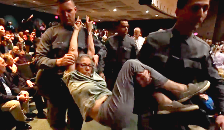 One of the voters who spoke out was social worker Emily Feiner. When security was physically removing her from the event, other attendees broke out in chants of "Let her stay, let her stay!" and "Shame, shame!"