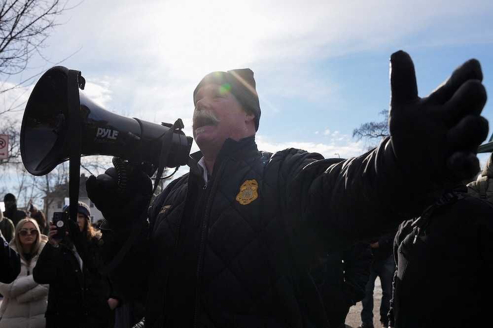 A representative of Minneapolis Police talks to the people gathering at a makeshift memorial in Minneapolis, Minnesota, U.S., January 9, 2026. REUTERS/Tim Evans