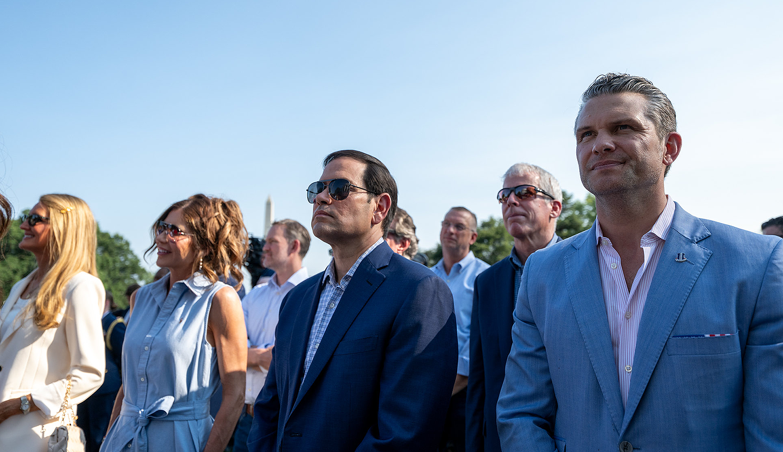 Secretary of Homeland Security Kristi Noem, Secretary of State Marco Rubio, and Secretary of Defense Pete Hegseth watch President Donald Trump deliver remarks before signing the One Big Beautiful Bill Act on the South Lawn of the White House, Friday, July 4, 2025, during the 4th of July picnic. (Official White House Photo by Molly Riley)