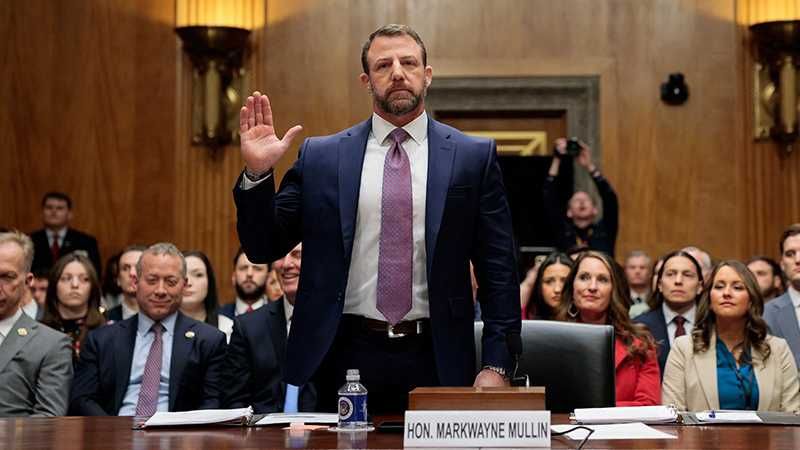 U.S. Senator Markwayne Mullin, President Donald Trump's nominee to be Homeland Security secretary, swears in at