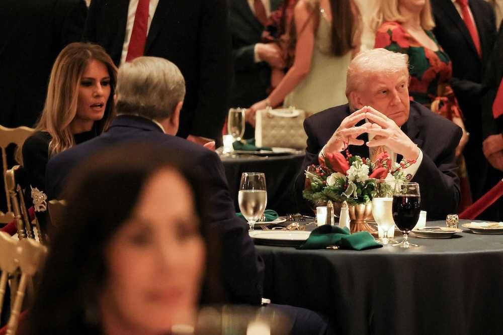 U.S. President Donald Trump, first lady Melania Trump and Viktor Knavs, Melania Trump's father, take part in a Christmas Eve dinner in the ballroom of his Mar-a-Lago club in Palm Beach, Florida, U.S., December 24, 2025. REUTERS/Jessica Koscielniak