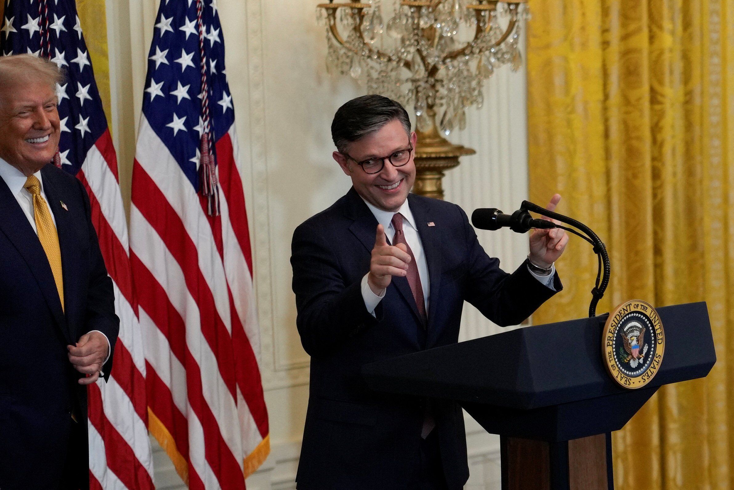 U.S. House Speaker Mike Johnson speaks next to U.S. President Donald Trump as he hosts a dinner with Republican members of the U.S. Congress in the East Room of the White House in Washington, D.C., U.S., July 22, 2025. REUTERS/Kent Nishimura