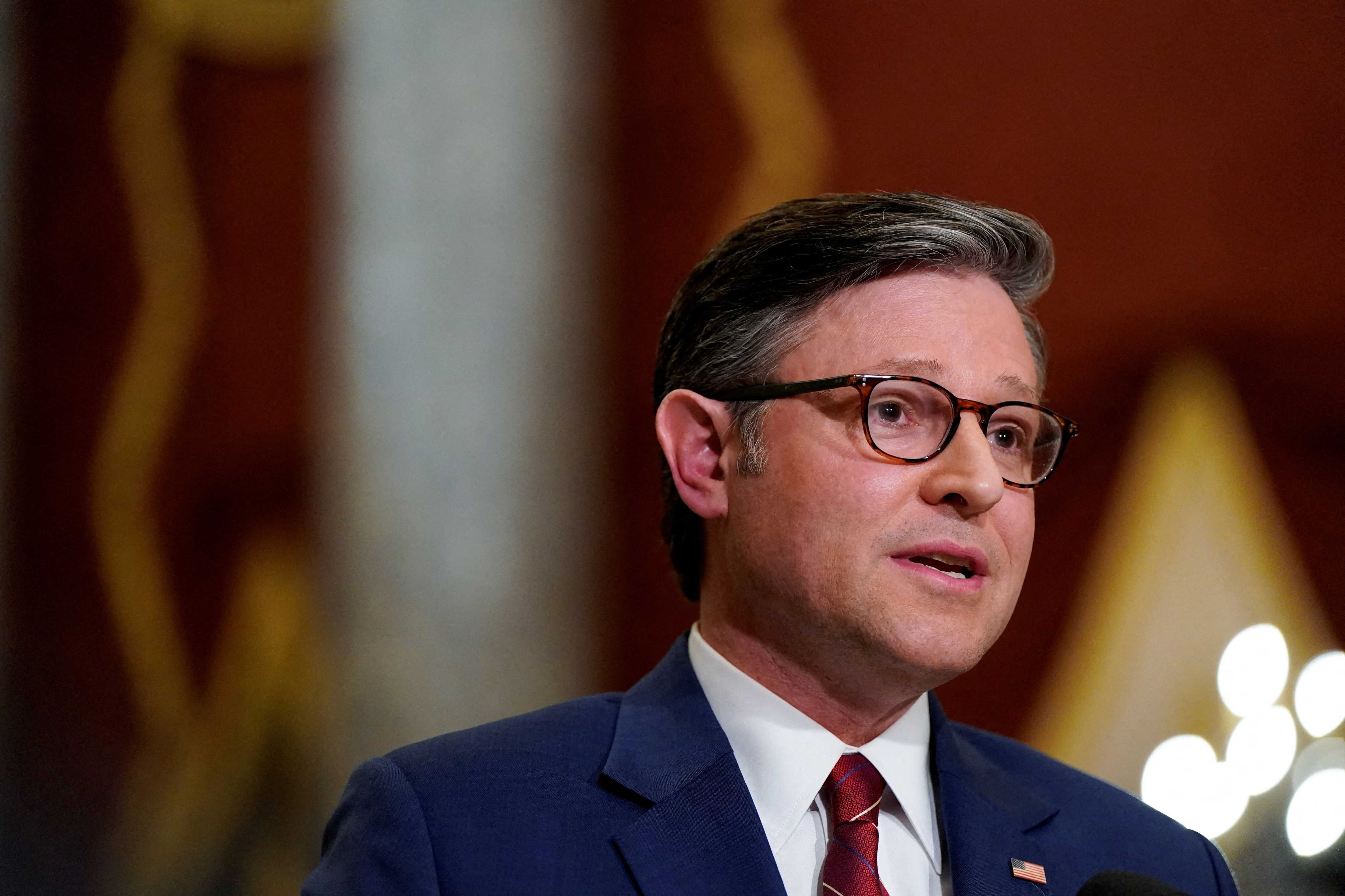 U.S. House Speaker Mike Johnson (R-LA) speaks to members of the media following the passage of a funding bill in the U.S. House of Representatives to bring the longest U.S. government shutdown in history to a close, which now requires U.S. President Donald Trump's signature, on Capitol Hill in Washington, D.C., U.S., November 12, 2025. REUTERS/Elizabeth Frantz