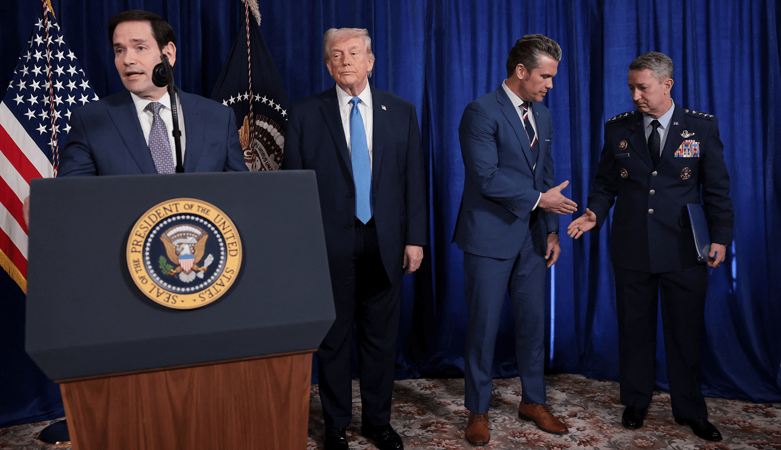 U.S. Secretary of State Marco Rubio speaks as U.S. President Donald Trump, Secretary of Defense Pete Hegseth, and General Dan Caine, Chairman of the Joint Chiefs of Staff, stand behind him in Palm Beach, Florida, U.S., January 3, 2026. REUTERS/Jonathan Ernst