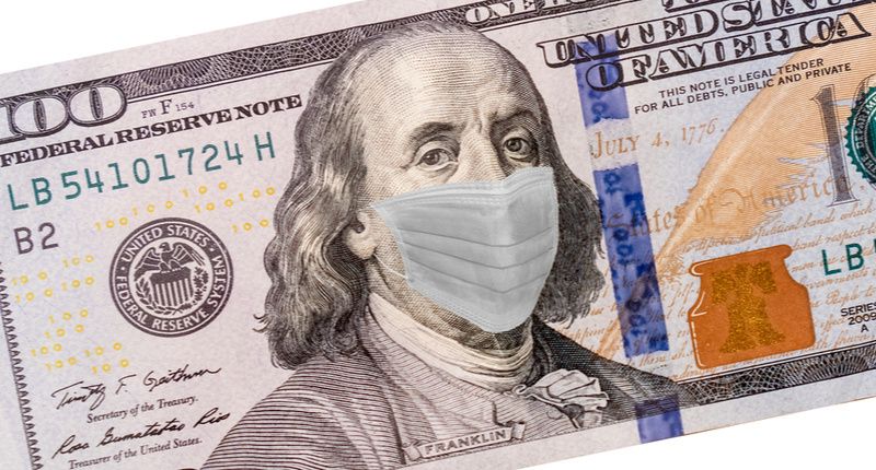 Benjamin Franklin With Worried and Concerned Expression Wearing Medical White Face Mask On One Hundred Dollar Bill