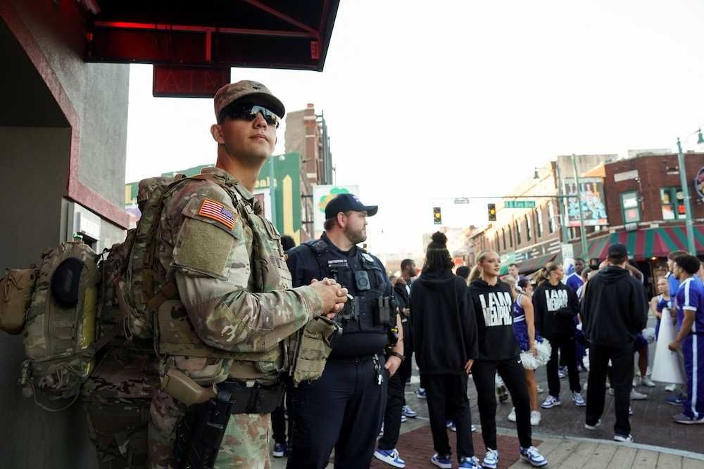 U.S. Army National Guard members assist Memphis Police Department in the entertainment district, Beale Street, in downtown Memphis, Tennessee, U.S., October 16, 2025. REUTERS/Karen Pulfer Focht