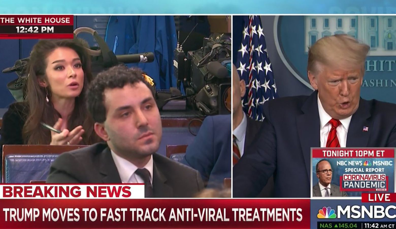 The White House press briefing room this week implemented a temporary seating chart to accommodate the Center for Disease Control and Preventions’s social distancing guidelines, but Donald Trump's staff still managed to carve out space for One America News Network, the far-right network known for it’s pro-Trump content. And on Thursday, that network's correspondent, Chanel Rion used her hard-hitting journalistic chops to ask the president whether he considers the term "Chinese food" racist, and rant against the "left-wing media” that "consistently [sides] with foreign state propaganda" just to oppose Trump.
