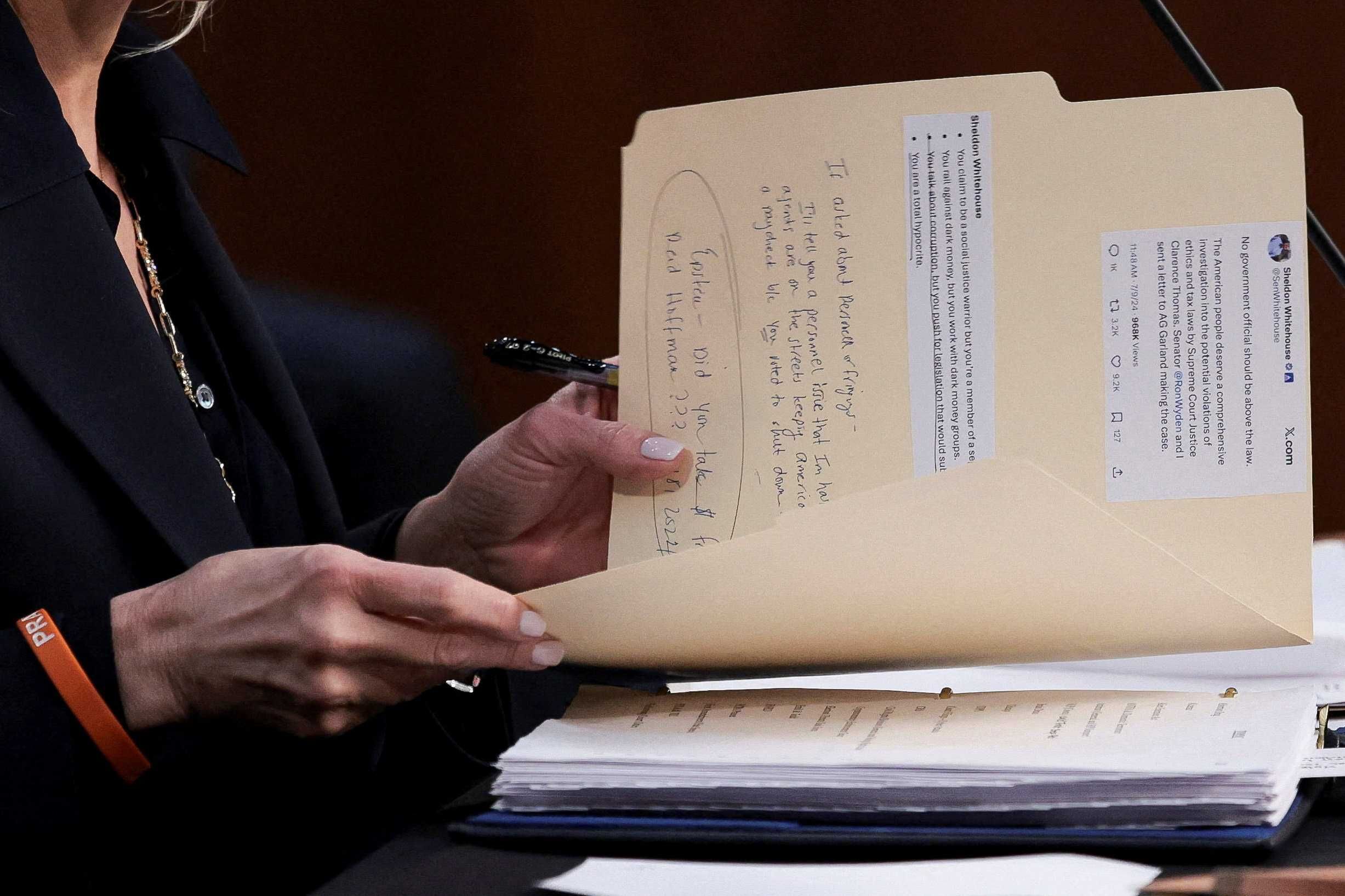 The top of the folder showed a July X post from Whitehouse calling for an investigation into Supreme Court Justice Clarence Thomas and a bulleted list of comebacks.