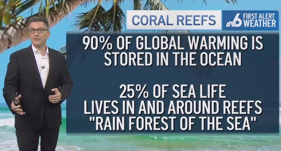 MacLaughlin thusly noted that "ninety percent of global warming is stored in the ocean and twenty-five percent of sea life lives in and around the reefs. We call it the rainforest of the sea. Look at all these benefits: Protection; food and shelter for marine life; protection of coastlines when a hurricane is approaching, so the storm surge actually gets tamped down a little bit; education and research, tourism and recreation."