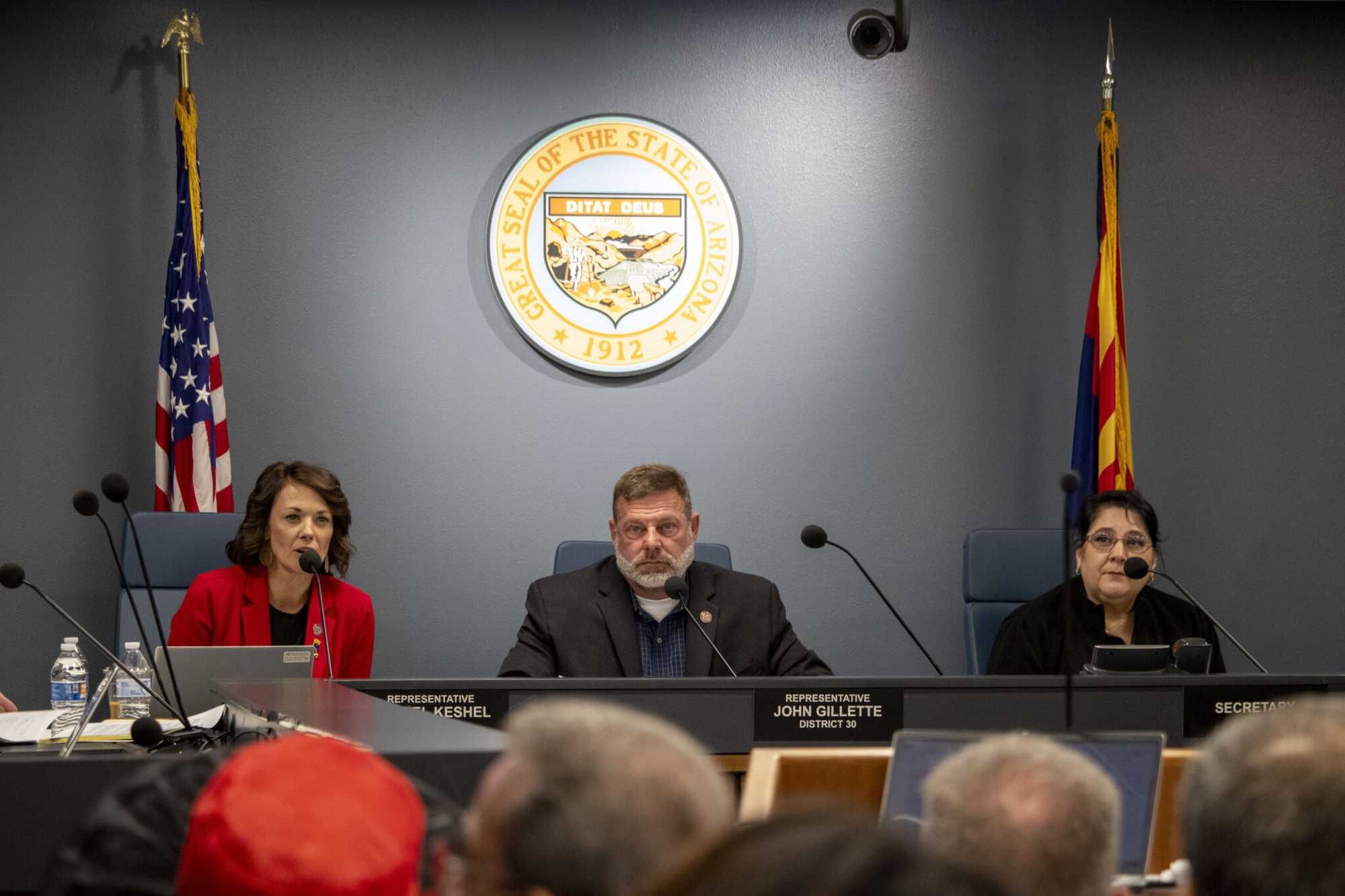 Rep. John Gillette, R-Kingman, listens to testimony in the House Committee on Federalism, Military Affairs and Elections on Jan. 21, 2026. To his left is Rep. Rachel Keshel, R-Tucson. (Photo by Jerod MacDonald-Evoy/Arizona Mirror)