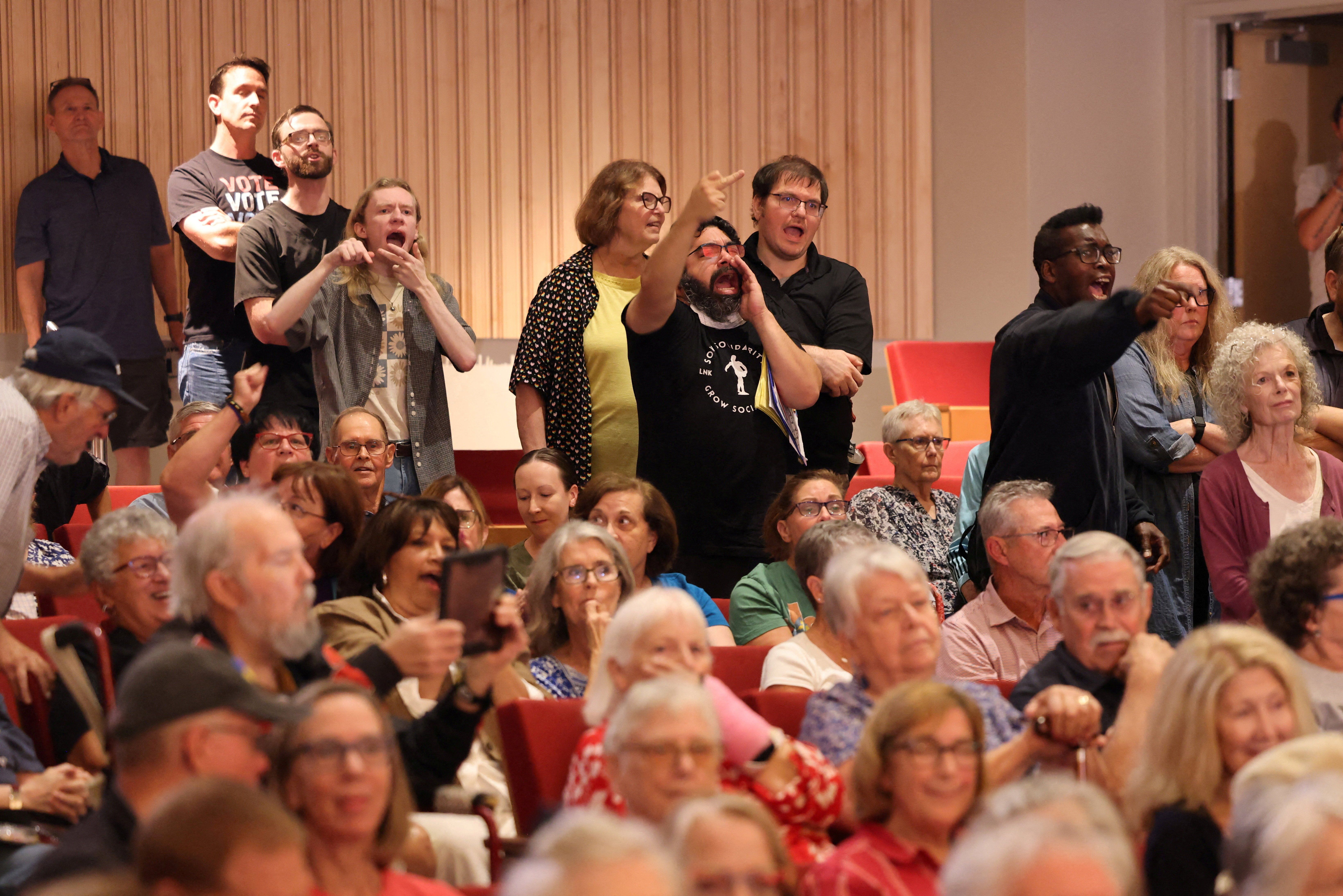 Constituents react as U.S. Representative Mike Flood (R-NE) answers questions during a town hall in Lincoln, Nebraska, U.S., August 4, 2025. REUTERS/Scott Morgan