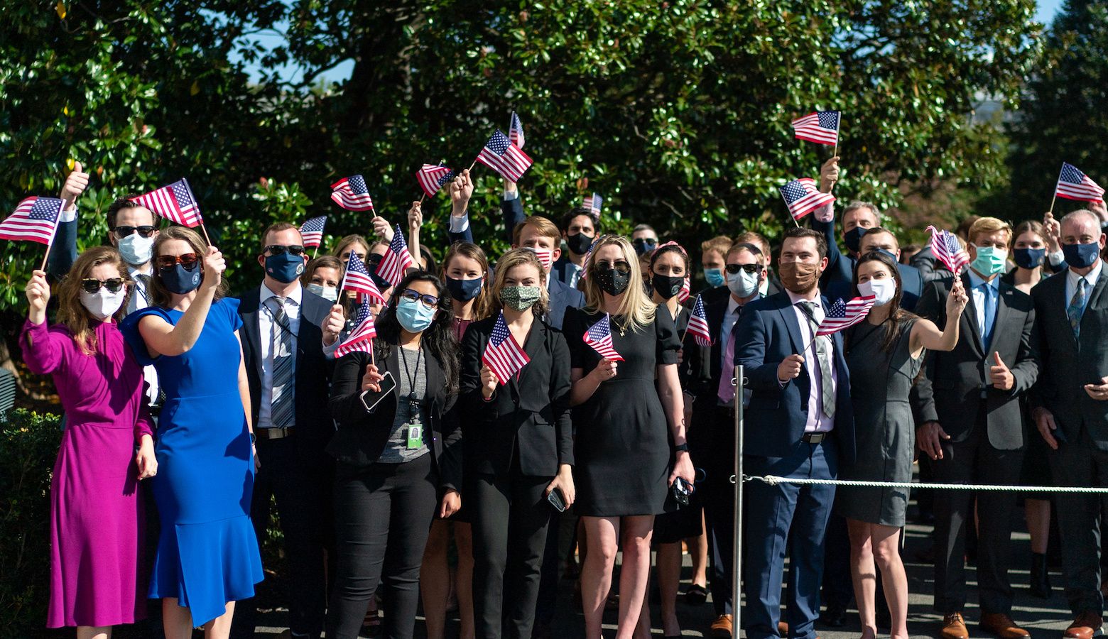 White House staff members wave American flags as Marine One with President Donald J. Trump and First Lady Melania Trump aboard departs the South Lawn of the White House Thursday, Oct. 22, 2020, to begin their trip to Nashville, Tenn.