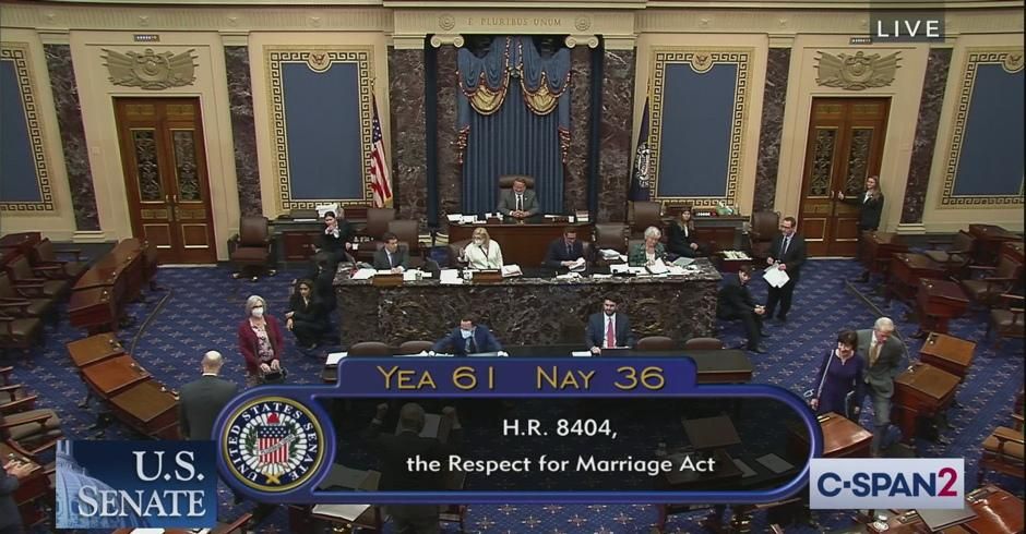 Far-right activists and organizations for months have been falsely claiming legislation to protect same-sex marriages would destroy different-sex marriages and take away religious rights from ordinary Americans, but early Tuesday evening on a bipartisan basis the Senate passed the Respect for Marriage Act, 61-36.