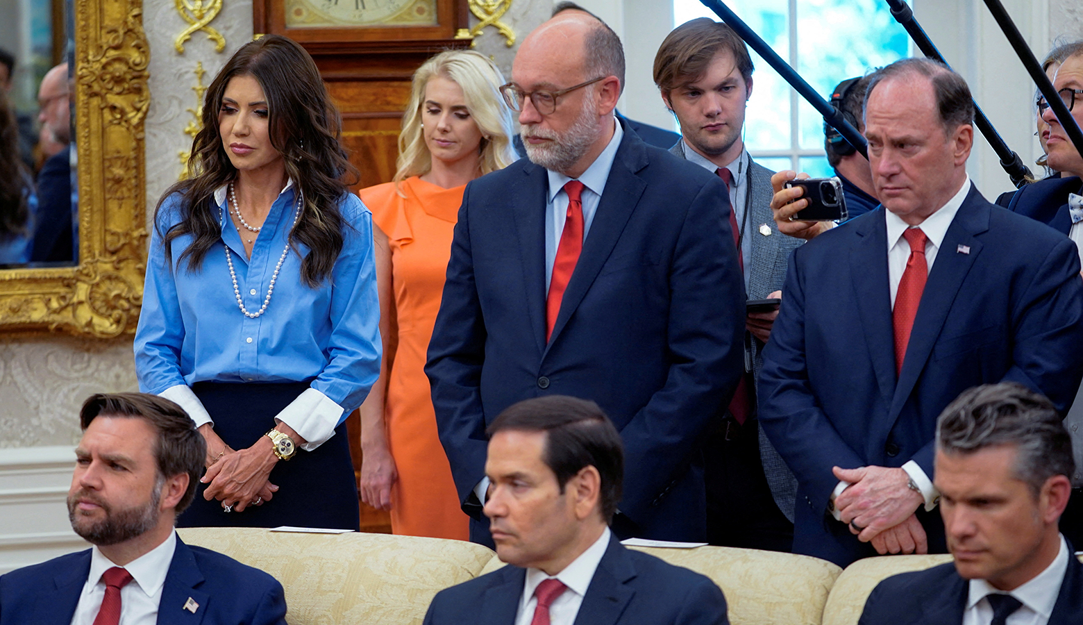 U.S. Homeland Security Secretary Kristi Noem and director of the Office of Management and Budget (OMB) Russell Vought stand, as U.S. Vice President JD Vance, U.S. Secretary of State Marco Rubio, and U.S. Defense Secretary Pete Hegseth sit in the Oval Office during a bilateral meeting between U.S. President Donald Trump and Finland's President Alexander Stubb, at the White House in Washington, D.C., U.S., October 9, 2025. REUTERS/Nathan Howard