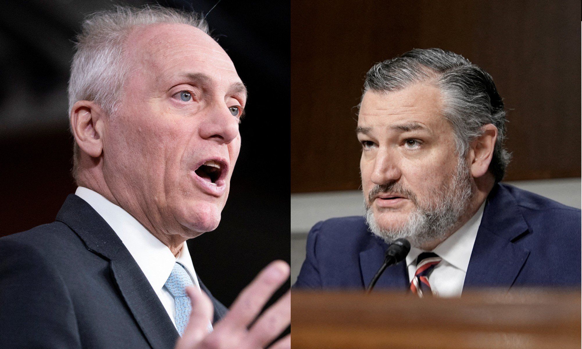Left: U.S. House Majority Leader Steve Scalise (R-LA) on March 11, 2025. REUTERS/Nathan Howard Right: U.S. Senator Ted Cruz (R-TX) on April 2, 2025. REUTERS/Ken Cedeno