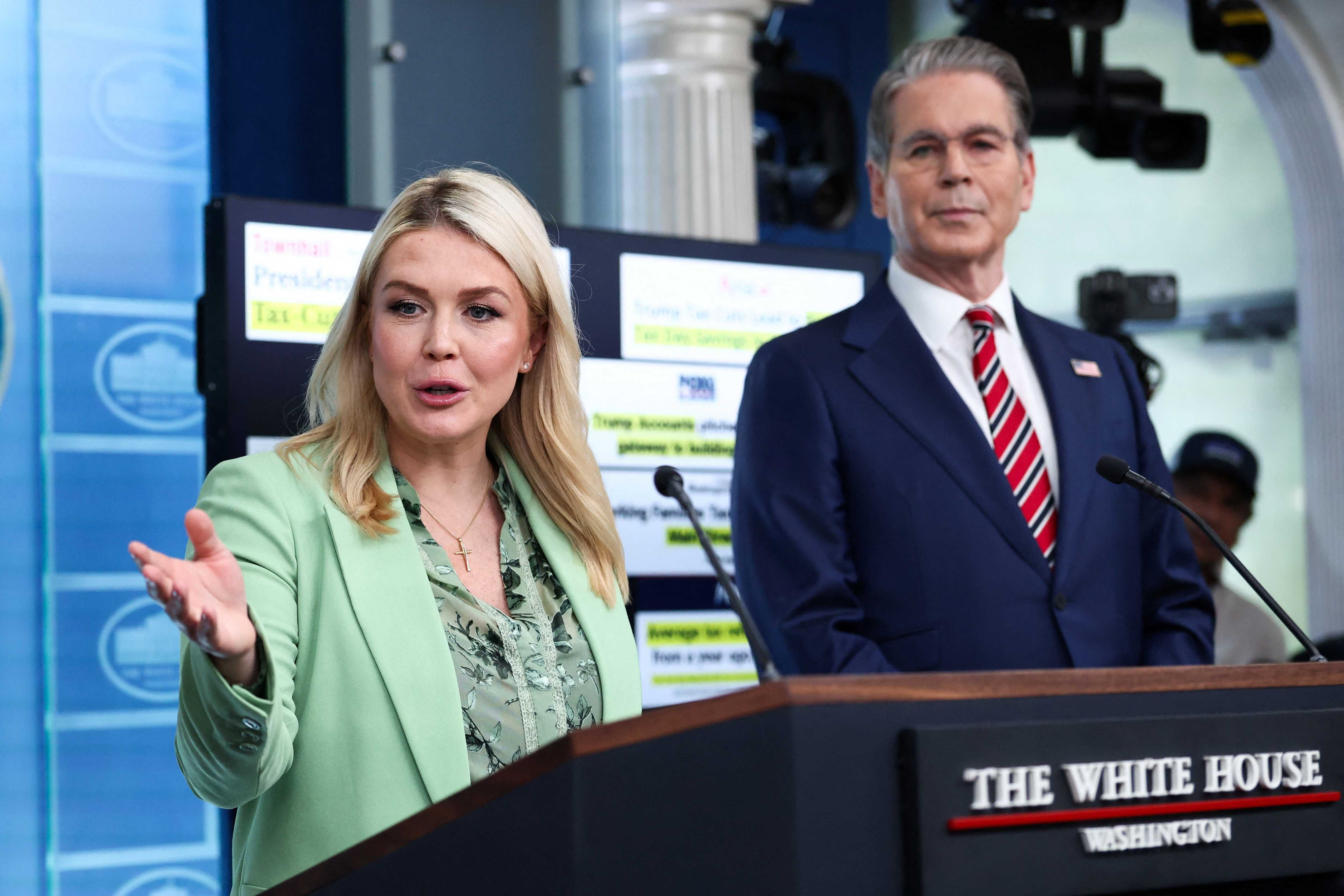 White House Press Secretary Karoline Leavitt and U.S. Treasury Secretary Scott Bessent at the White House in Washington, D.C., U.S., April 15, 2026. REUTERS/Kevin Lamarque