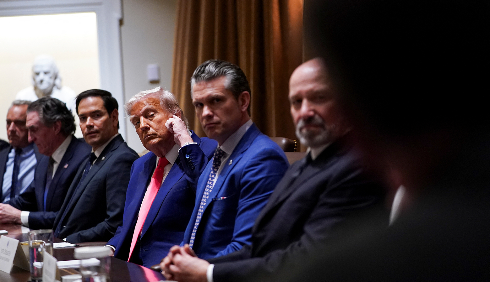 U.S. President Donald Trump, Health Secretary Robert F. Kennedy Jr., Secretary of the Interior Doug Burgum, U.S. Secretary of State Marco Rubio, Secretary of Defense Pete Hegseth and Commerce Secretary Howard Lutnick attend a cabinet meeting at the White House in Washington, D.C., U.S., April 10, 2025. REUTERS/Nathan Howard