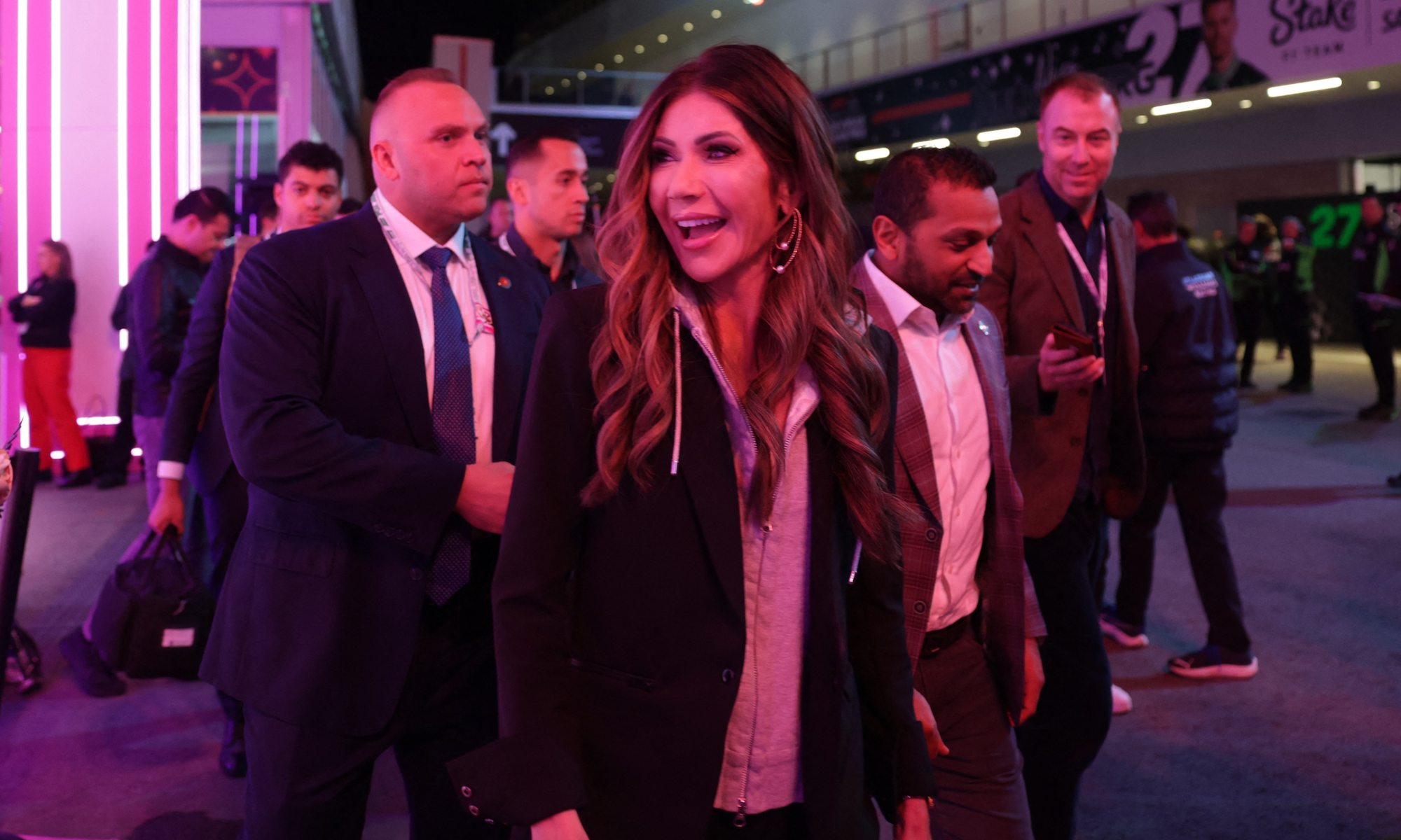 Formula One F1 - Las Vegas Grand Prix - Las Vegas Strip Circuit, Las Vegas, Nevada, United States - November 22, 2025 U.S. Homeland Security Secretary Kristi Noem arrives before the race REUTERS/Jeenah Moon