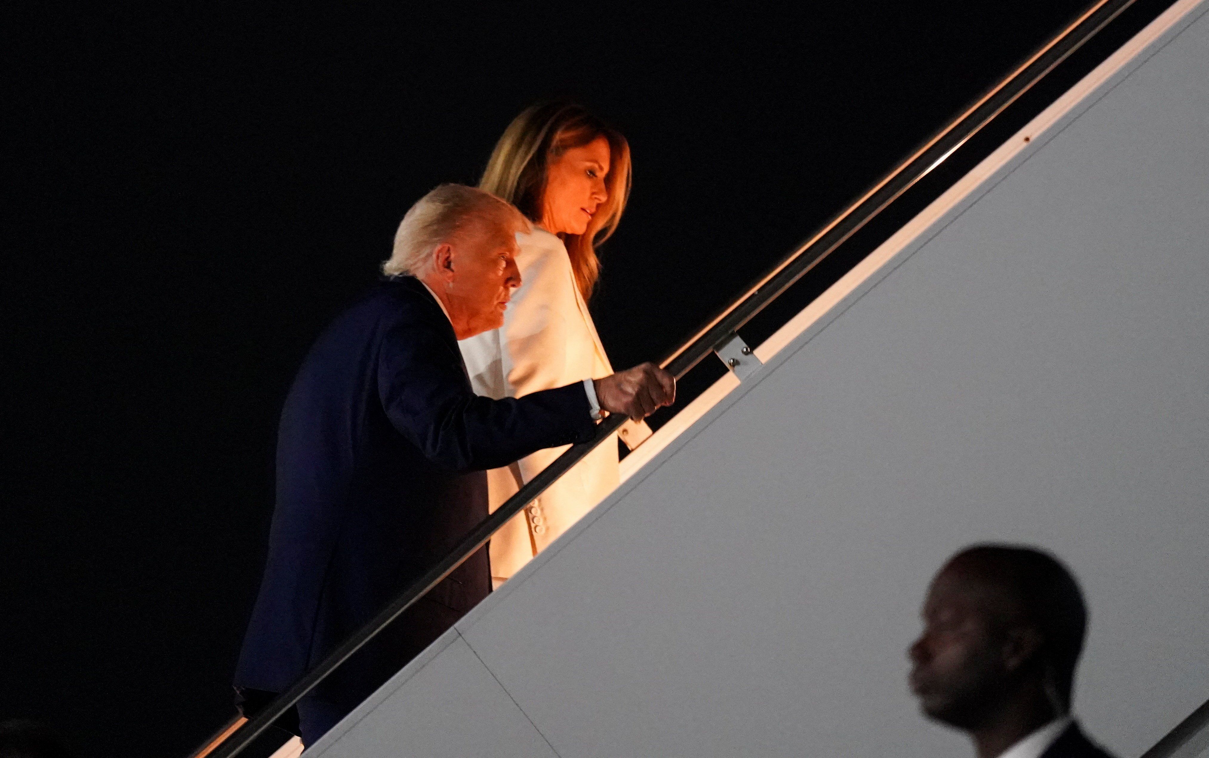 U.S. President Donald Trump and First Lady Melania Trump board the Air Force One, after attending the 80th United Nations General Assembly, at John F. Kennedy International Airport, in New York, U.S., September 23, 2025. REUTERS/Al Drago