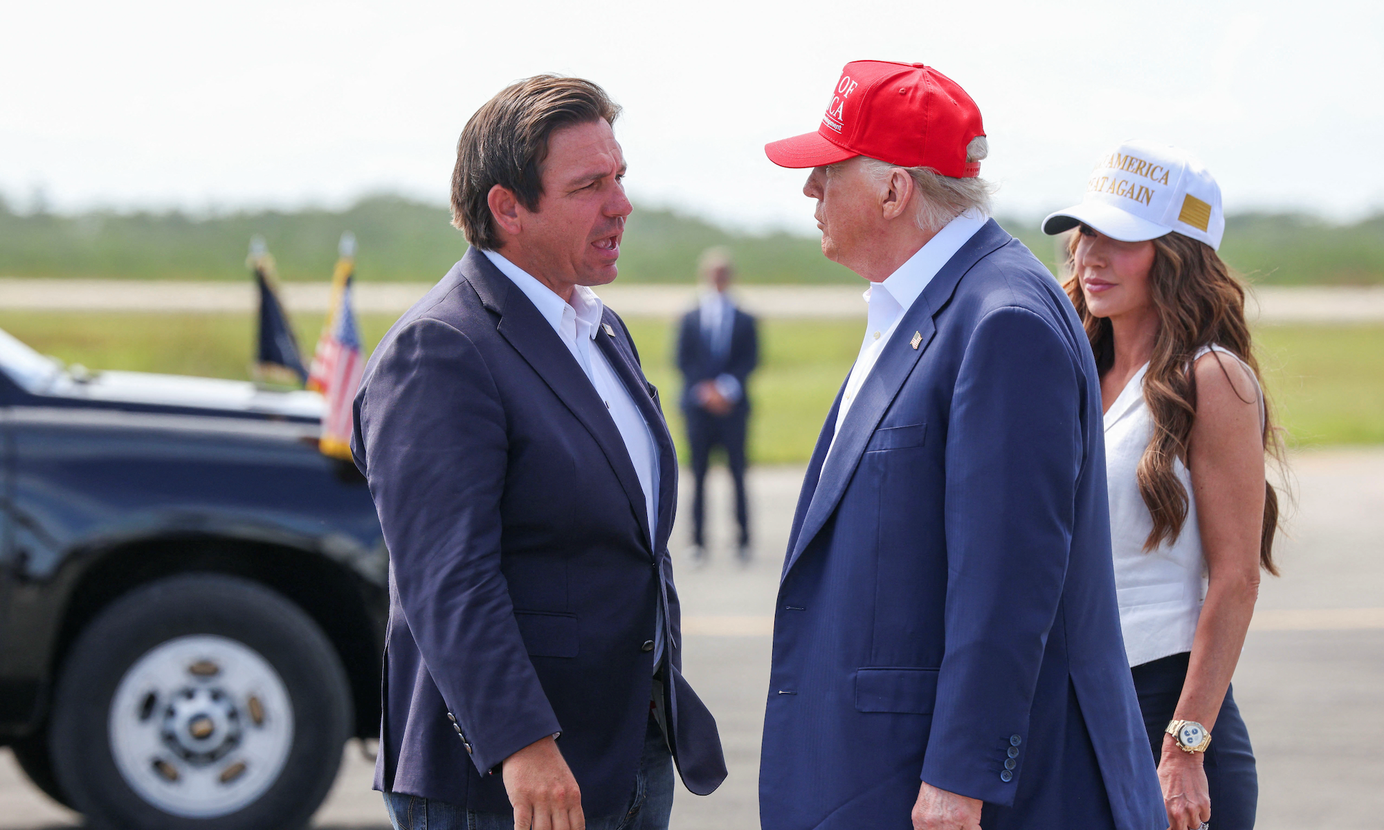U.S. President Donald Trump speaks with Florida Governor Ron DeSantis next to U.S. Homeland Security Secretary Kristi Noem at the Dade-Collier Training and Transition Airport on the day of the opening of a temporary migrant detention center informally known as "Alligator Alcatraz" in Ochopee, Florida, U.S., July 1, 2025. REUTERS/Evelyn Hockstein