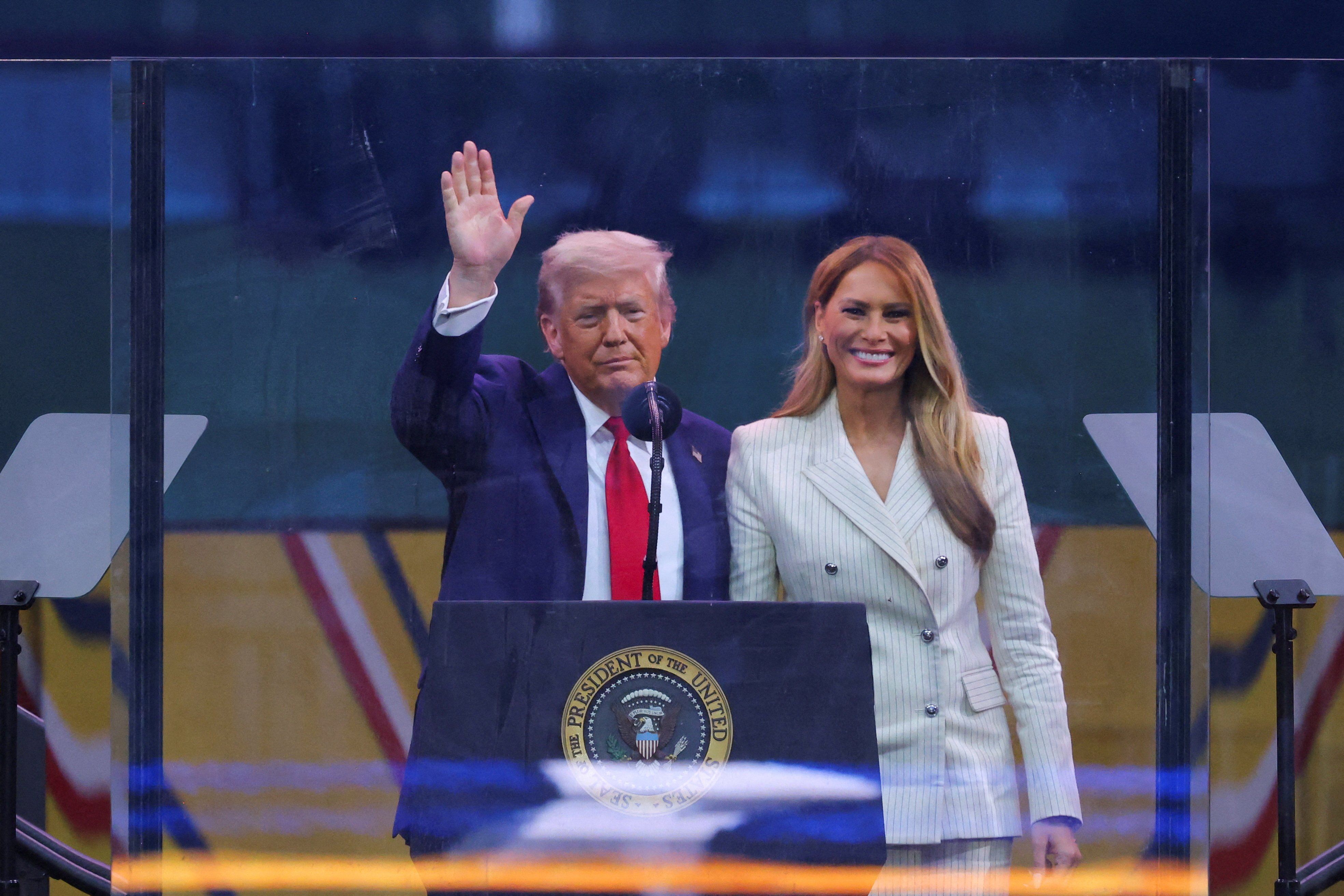 U.S. President Donald Trump waves next to first lady Melania Trump following the military parade to commemorate the U.S. Army's 250th Birthday, on the day of U.S. President Donald Trump 79th birthday, in Washington, D.C., U.S., June 14, 2025. REUTERS/Carlos Barria