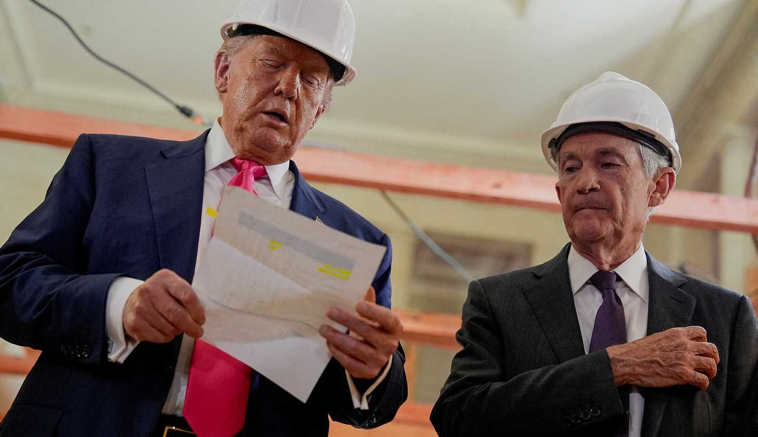 FILE PHOTO: Federal Reserve Chair Jerome Powell looks at U.S. President Donald Trump holding a document during a tour of the Federal Reserve Board building, which is currently undergoing renovations, in Washington, D.C., U.S., July 24, 2025. REUTERS/Kent Nishimura/File Photo