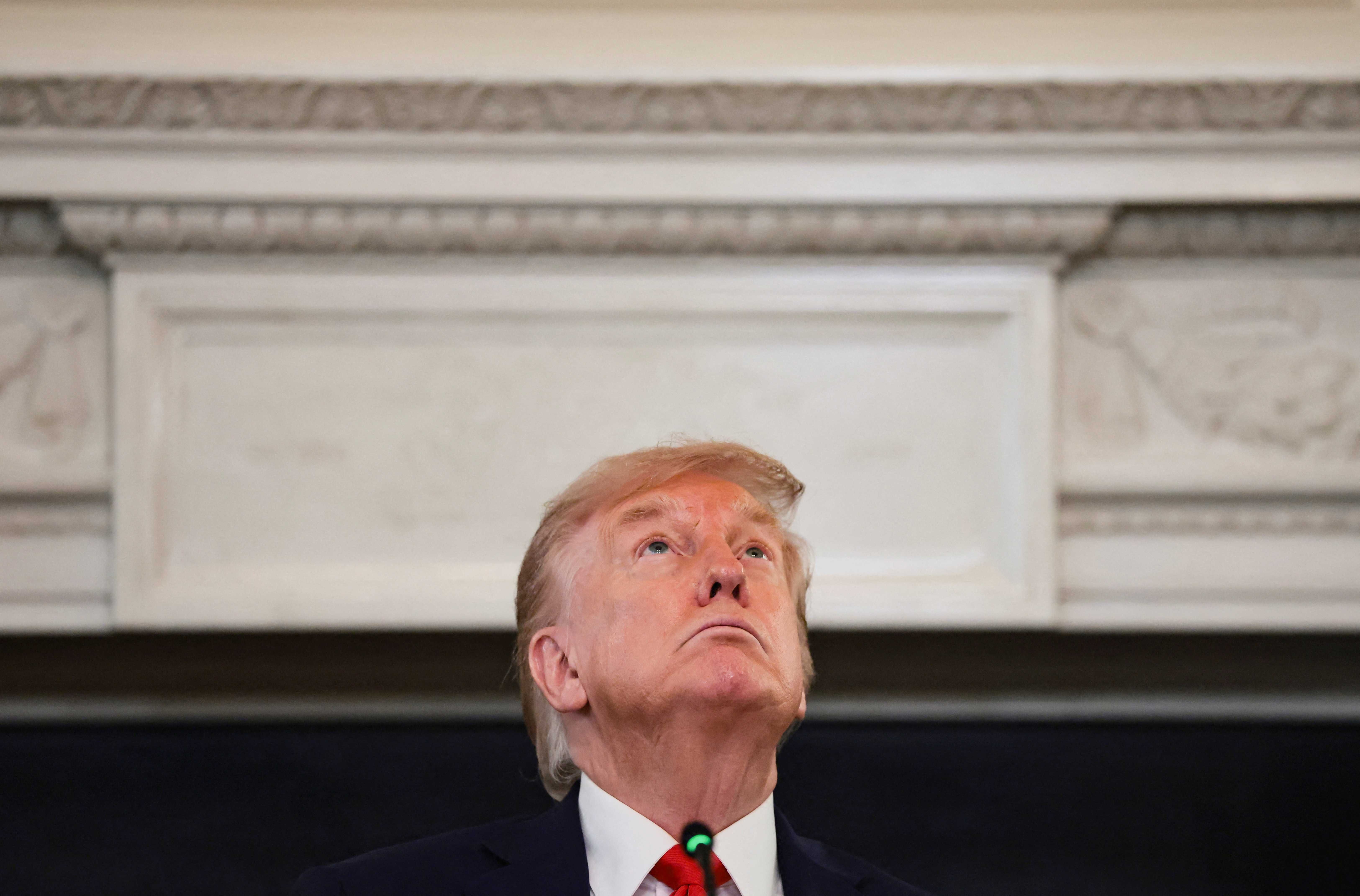 U.S. President Donald Trump looks up as he participates in a roundtable on antifa, an anti-fascist movement he designated a domestic terrorist organization via executive order on September 22, at the White House in Washi