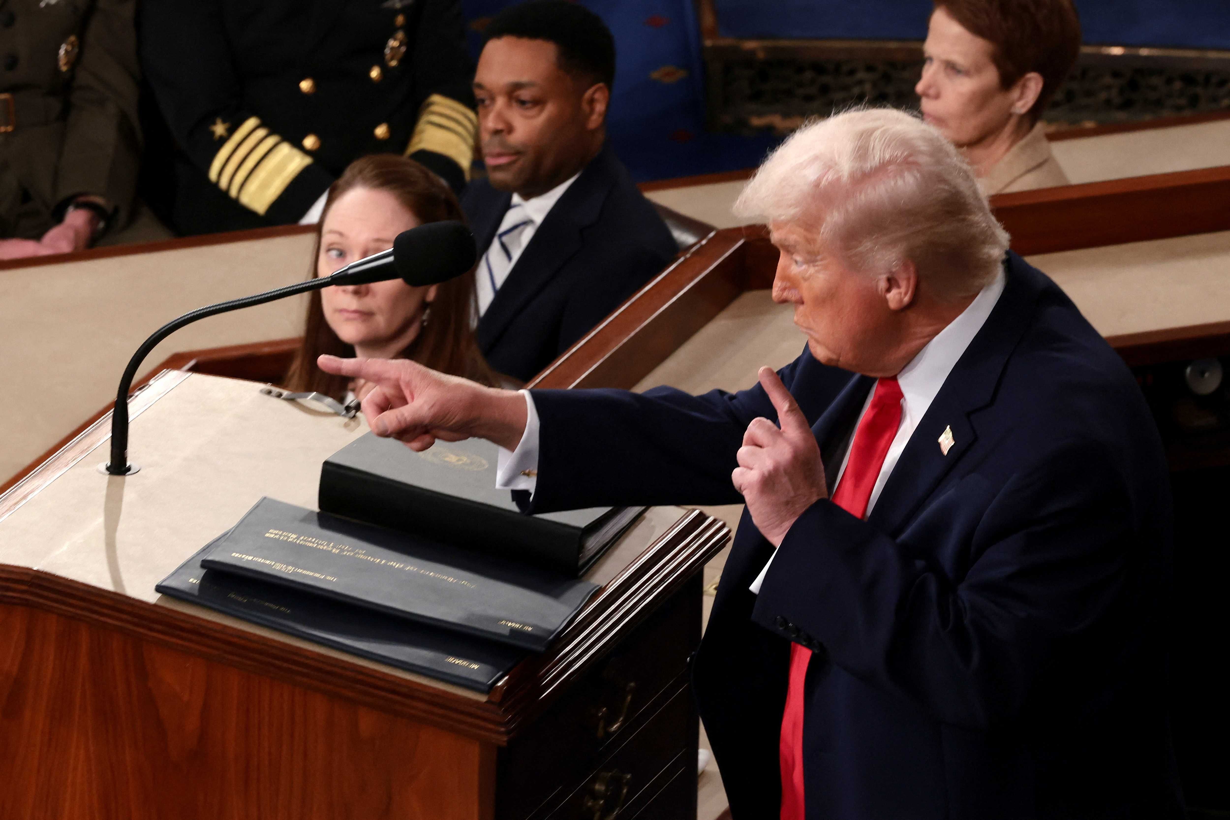U.S. President Donald Trump points as he delivers the State of the Union address in the House Chamber of the U.S. Capitol in Washington, D.C., U.S., February 24, 2026. REUTERS/EVELYN HOCKSTEIN
