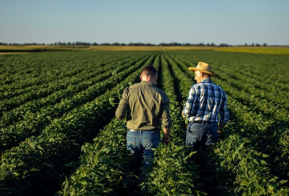 Two farmers in a field looking at a soy crop (Zoran Zeremski/Shutterstock.com)
