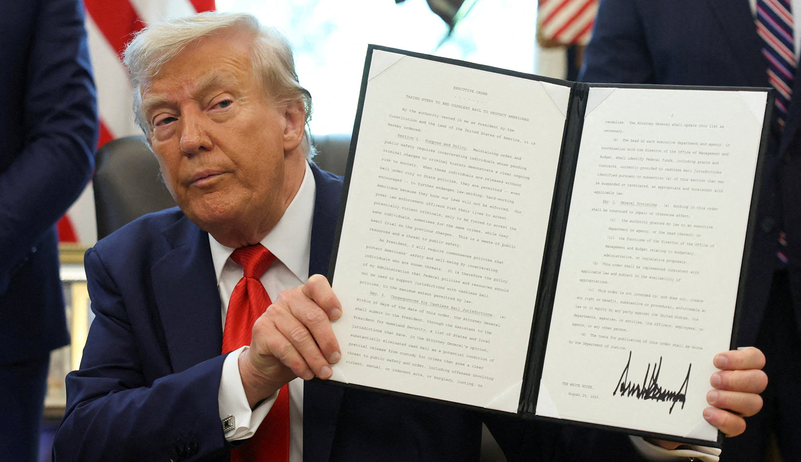 U.S. President Donald Trump holds up an executive order after signing it in the Oval Office at the White House in Washington, D.C., U.S., August 25, 2025. REUTERS/Jonathan Ernst TPX IMAGES OF THE DAY