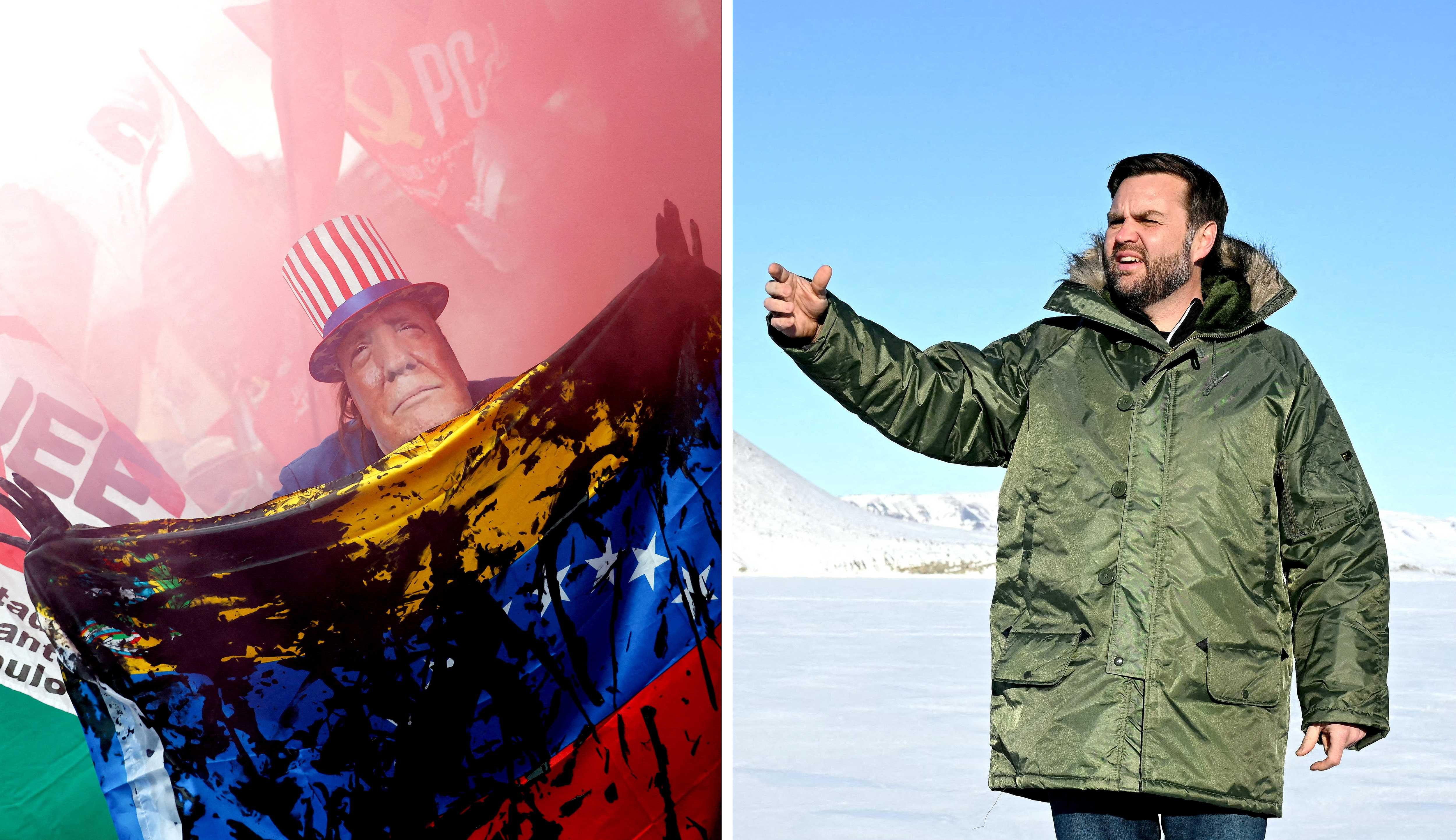 Left: A man wears a mask depicting U.S. President Donald Trump during a protest against U.S. strikes on Venezuela in Sao Paulo, Brazil January 5, 2026. REUTERS/Tuane Fernandes TPX IMAGES OF THE DAY Right: U.S. Vice President JD Vance tours the U.S. military's Pituffik Space Base in Greenland on March 28, 2025. Jim Watson/Pool via REUTERS/File Photo