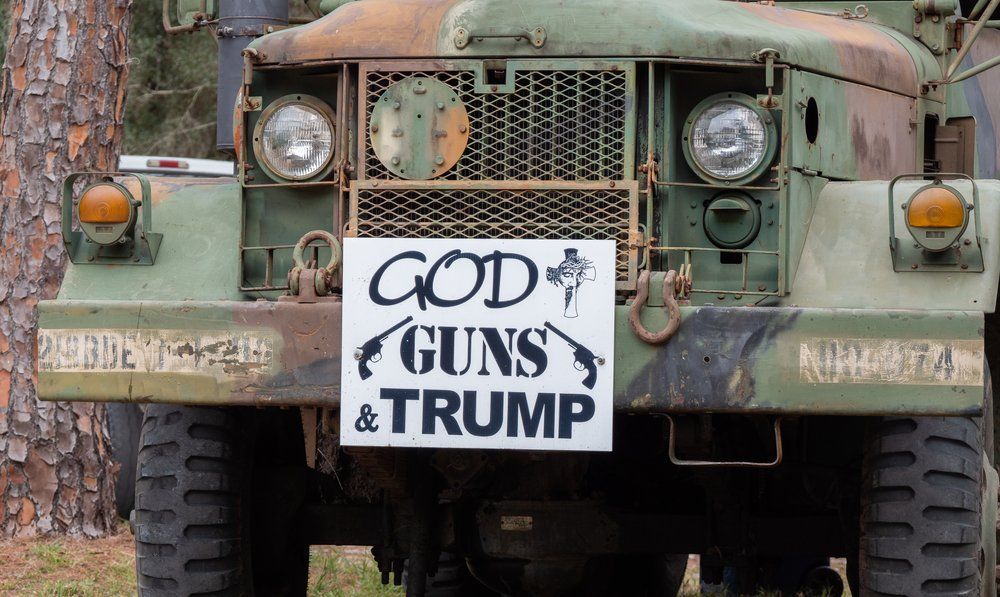 A "God, Guns and Trump" sign placed on an old military bus in November 2020 (Florida Chuck/Shutterstock.com)