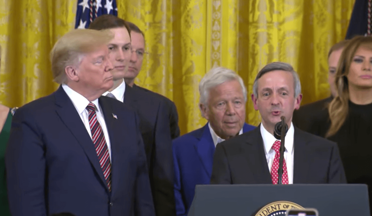 Also present during Wednesday’s event were Trump defender, attorney Alan Dershowitz, New England Patriots owner Robert Craft, who was arrested earlier this year on a solicitation charge, and John Hagee, a pastor who has called Hitler a “half breed Jew” and a “hunter” who was fulfilling God’s will.