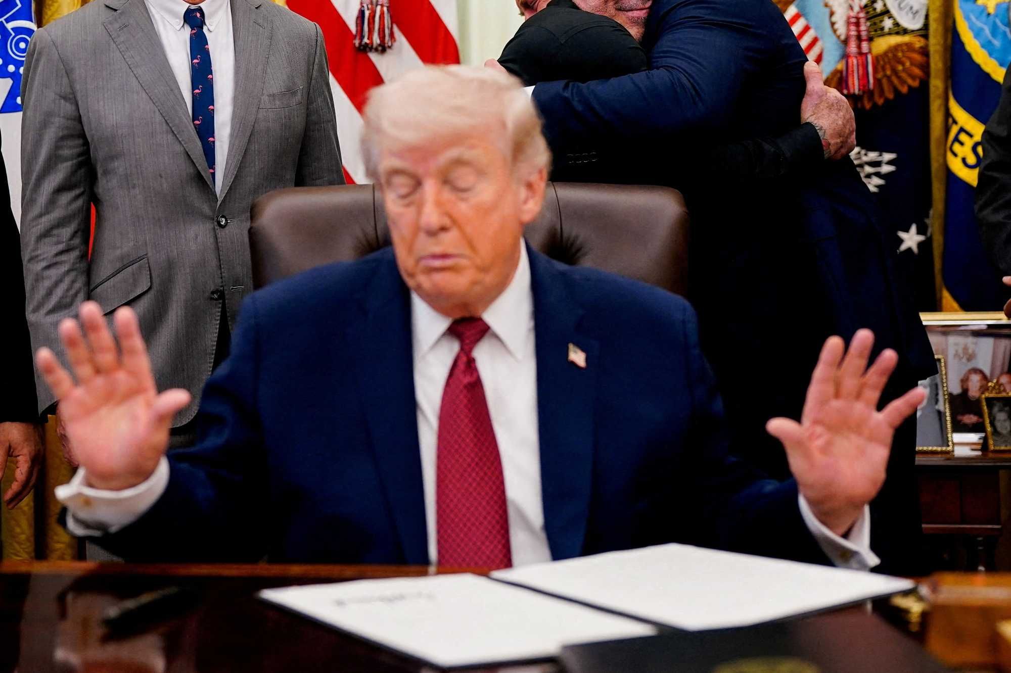 U.S. President Donald Trump gestures after he signed an executive order about easing restrictions on mental health treatments in the Oval Office of the White House in Washington, D.C., April 18, 2026. REUTERS/Nathan Howard