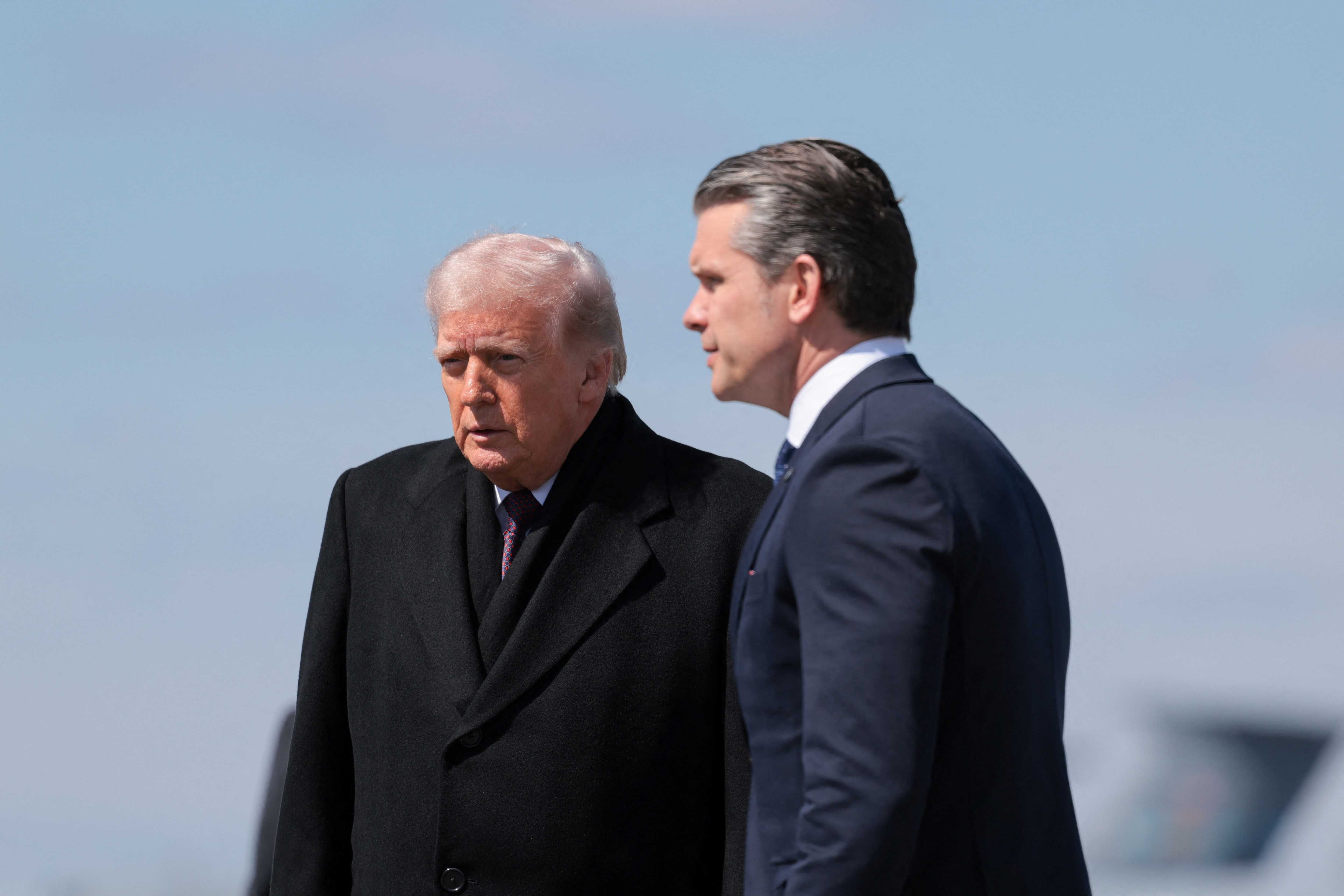 U.S. President Donald Trump and Secretary of Defense Pete Hegseth arrive at Dover Air Force Base in Dover, Delaware, U.S., March 18, 2026. REUTERS/Kylie Cooper